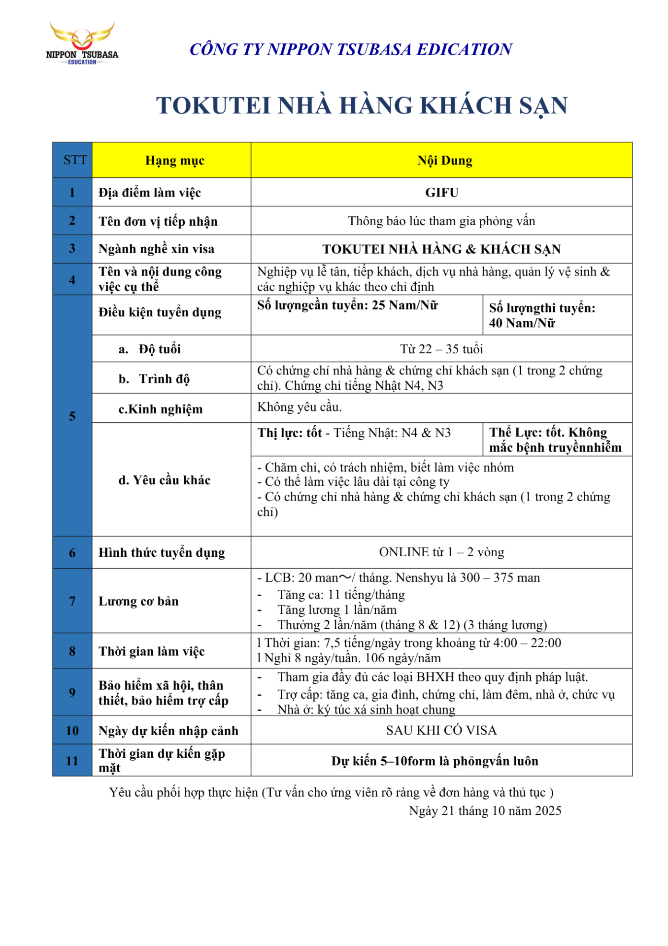 Đơn vị tuyển dụng: Công ty Nippon Tsubasa Education (NTE JAPAN) phối hợp cùng doanh nghiệp tiếp nhận tại Nhật Bản.Chương trình Kỹ năng đặc định (Tokutei Gino) trong ngành Nhà hàng – Khách sạn là một trong những lĩnh vực có nhu cầu tuyển dụng cao nhất tại Nhật Bản hiện nay. Ứng viên sẽ có cơ hội làm việc hợp pháp, lâu dài, hưởng lương – bảo hiểm – phúc lợi đầy đủ theo quy định của Chính phủ Nhật Bản.