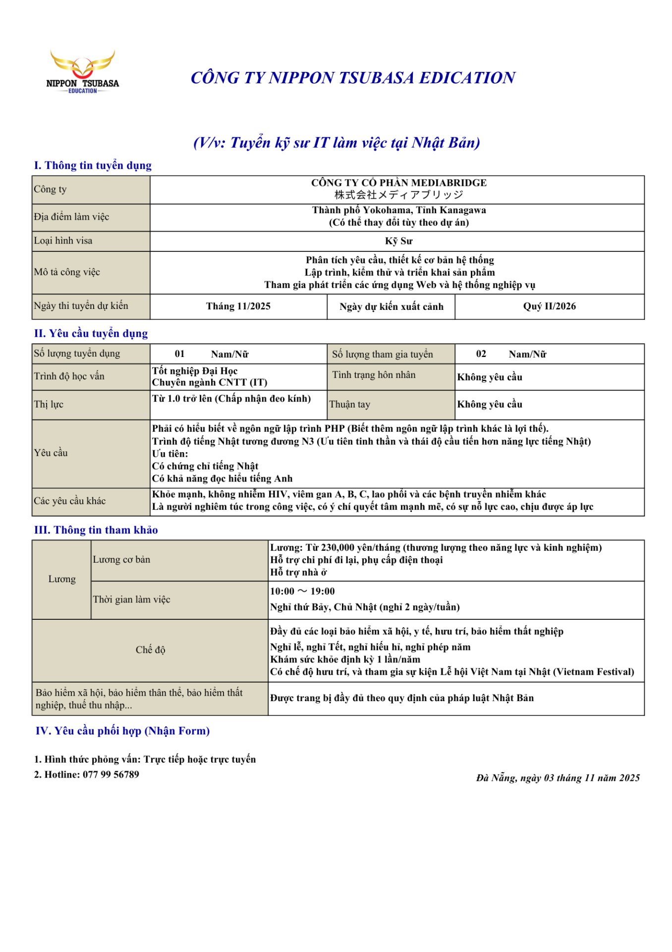 Đơn vị tuyển dụng: Công ty TNHH Nippon Tsubasa Education (NTE JAPAN) phối hợp cùng Công ty Cổ phần MEDIABRIDGE – doanh nghiệp công nghệ thông tin có trụ sở tại Yokohama, tỉnh Kanagawa, Nhật Bản.