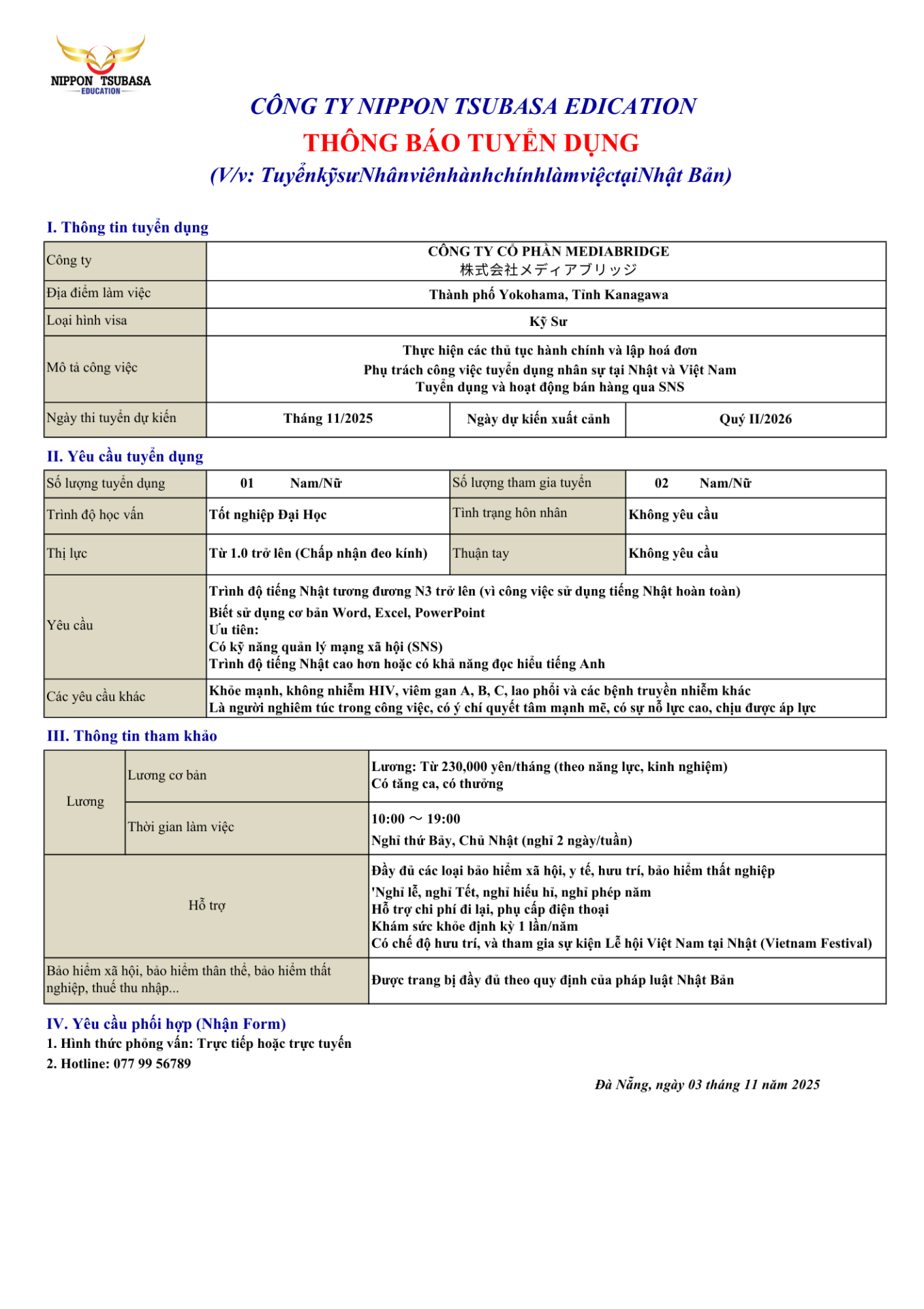 Nội dung Chi tiết Đơn vị tiếp nhận Công ty Cổ phần Mediabridge (株式会社メディアブリッジ) Địa điểm làm việc Thành phố Yokohama, tỉnh Kanagawa – Nhật Bản Loại hình visa Visa Kỹ sư (Kỹ thuật – Tri thức nhân văn – Nghiệp vụ quốc tế) Vị trí tuyển dụng Kỹ sư/Nhân viên hành chính Công việc chính Thực hiện thủ tục hành chính, lập hóa đơn, hỗ trợ công việc giữa Nhật và Việt Nam, phụ trách tuyển dụng – bán hàng qua mạng xã hội (SNS) Hình thức phỏng vấn Trực tuyến hoặc trực tiếp tại văn phòng Nippon Tsubasa Education Thời gian phỏng vấn dự kiến Tháng 11/2025 Dự kiến xuất cảnh Quý II/2026 -