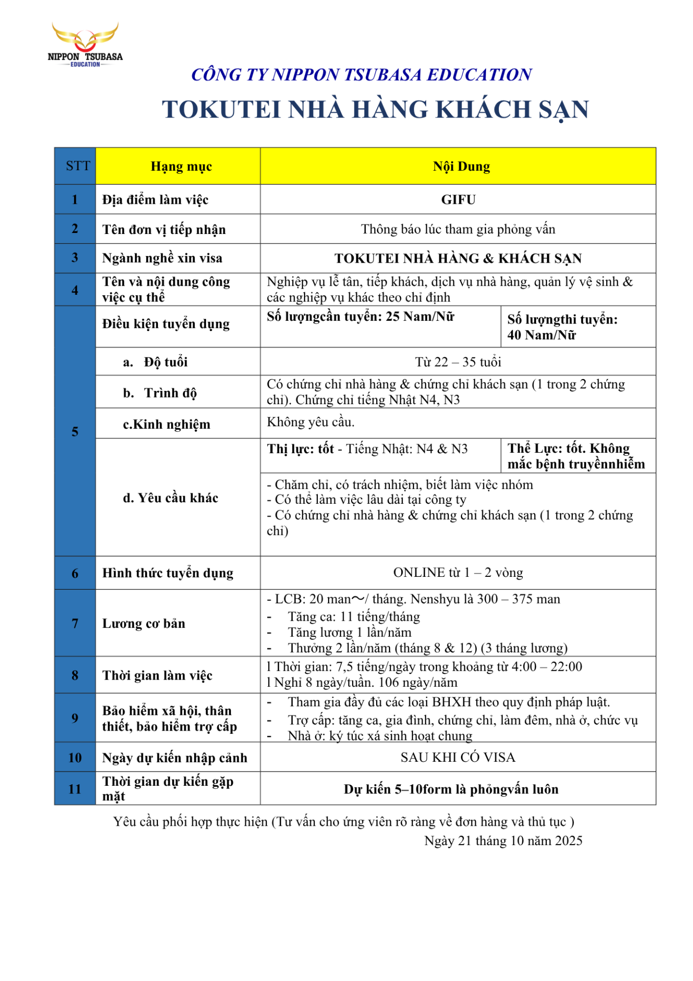 Đơn vị tuyển dụng: Công ty Nippon Tsubasa Education (NTE JAPAN) phối hợp cùng doanh nghiệp tiếp nhận tại Nhật Bản.Chương trình Kỹ năng đặc định (Tokutei Gino) trong ngành Nhà hàng – Khách sạn là một trong những lĩnh vực có nhu cầu tuyển dụng cao nhất tại Nhật Bản hiện nay. Ứng viên sẽ có cơ hội làm việc hợp pháp, lâu dài, hưởng lương – bảo hiểm – phúc lợi đầy đủ theo quy định của Chính phủ Nhật Bản.