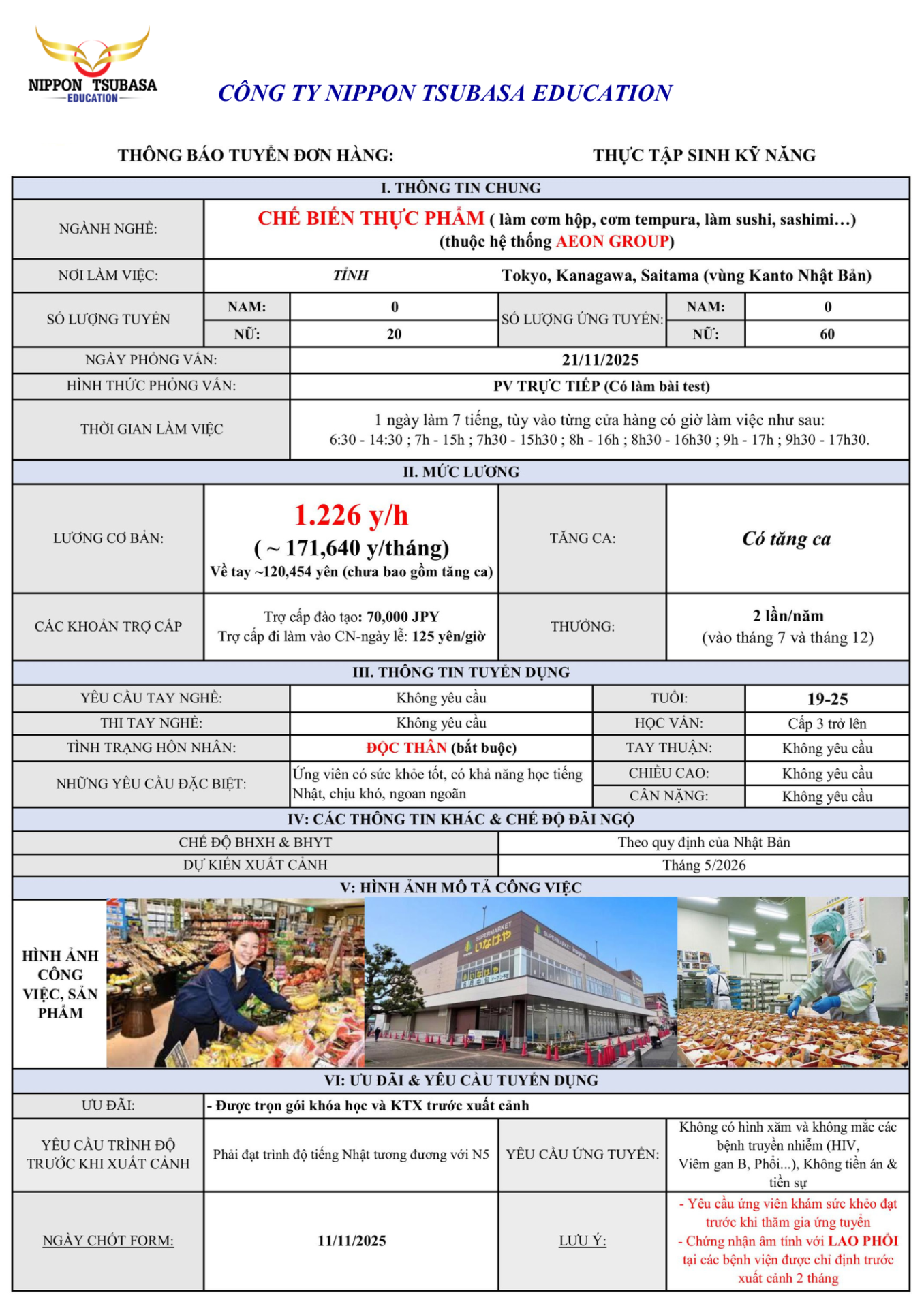 Ngành nghề: Chế biến thực phẩm (làm cơm hộp, cơm tempura, làm sushi, sashimi, các món ăn đóng gói sẵn).