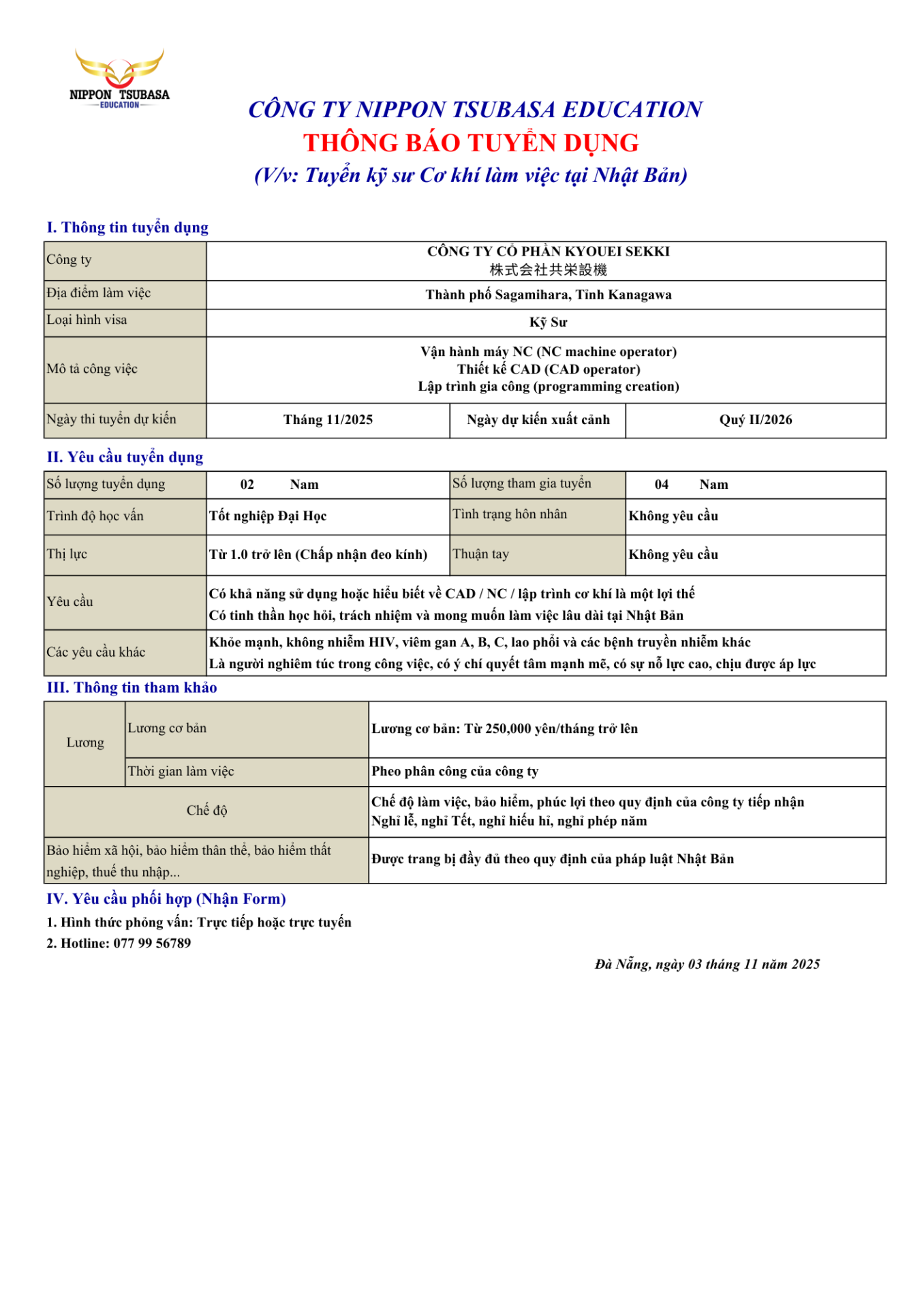 Nội dung Chi tiết Đơn vị tiếp nhận Công ty Cổ phần Kyouei Sekki (株式会社共栄設機) Địa điểm làm việc Thành phố Sagamihara, tỉnh Kanagawa, Nhật Bản Loại hình visa Visa Kỹ sư (Kỹ thuật – Tri thức nhân văn – Nghiệp vụ quốc tế) Mô tả công việc Vận hành máy NC (NC Machine Operator), thiết kế CAD (CAD Operator), lập trình gia công (Programming Creation) Thời gian phỏng vấn Tháng 11/2025 Dự kiến xuất cảnh Quý II/2026 Đây là đơn tuyển kỹ sư lâu dài, được ký hợp đồng chính thức với công ty Nhật Bản, hưởng đầy đủ quyền lợi và chế độ lao động theo quy định của Chính phủ Nhật.